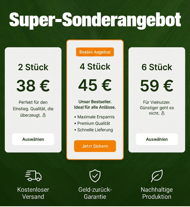 Nutzen Sie jetzt unseren Mengenrabatt: 6 Einheiten für nur 55 Euro (statt der Einzelpreise). Diese Sonderaktion endet in 60 Minuten. Sichern Sie sich jetzt die mühelose Freiheit für Ihren Garten und bestellen Sie versandkostenfrei.
